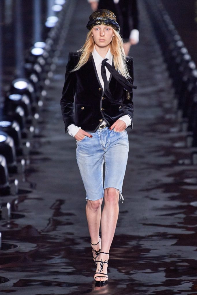 حرصت دار Saint Laurent على تقديم القميص الأبيض بإطلالة غلب عليها الطابع الكلاسيكي بفضل سترة من المخمل وربطة عنق سوداء. ولكن دخلت عليها لمسات “كاجوال” من خلال سروال الدنيم القصير والوشاح البراق الذي التف حول الرأس.