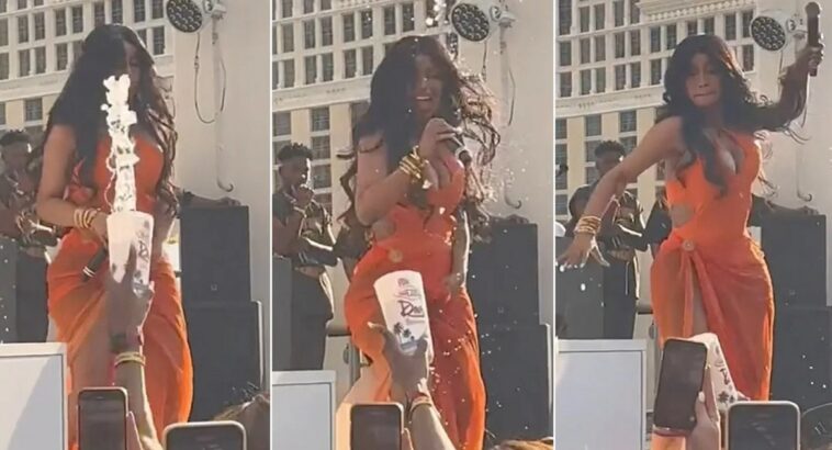 وكانت كاردي بي، فقدت أعصابها خلال حفل فني بلاس فيغاس، بعد أن ردّت على شخص ألقى عليها مشروبًا بقذفه بـ “الميكروفون”.