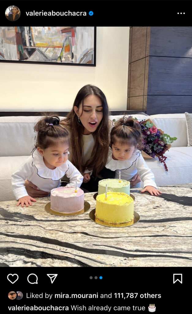 وظهرت فاليري في مجموعة صور، شاركتها عبر حسابها الرسمي على انستغرام، وهي تتوسط ابنتيها، وأمامهم قالب الكيك احتفالاً بميلادها.