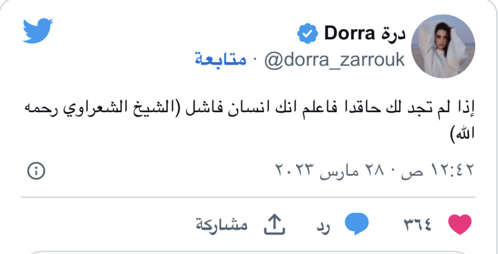 وبعدها مباشرة غردت قائلة: الغباء أخطر بكثير من الشر، فالشر يأخذ أجازة من حين لآخر أما الغباء فيستمر (أناتول فرانس).واختتمت بمقولة الشعراوي: إذا لم تجد لك حاقداً فاعلم أنك إنسان فاشل.
