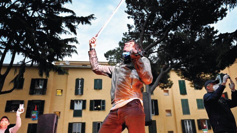 يمنع فيروس «كورونا» المستجد الناس من الخروج لحضور الحفلات، لكنه لا يحول دون تنقل الفنانين لإحياء حفلاتهم في ساحات المجمعات السكانية للقاطنين المحجورين في أحياء روما الشعبية، لإضحاكهم وتحميسهم للرقص.