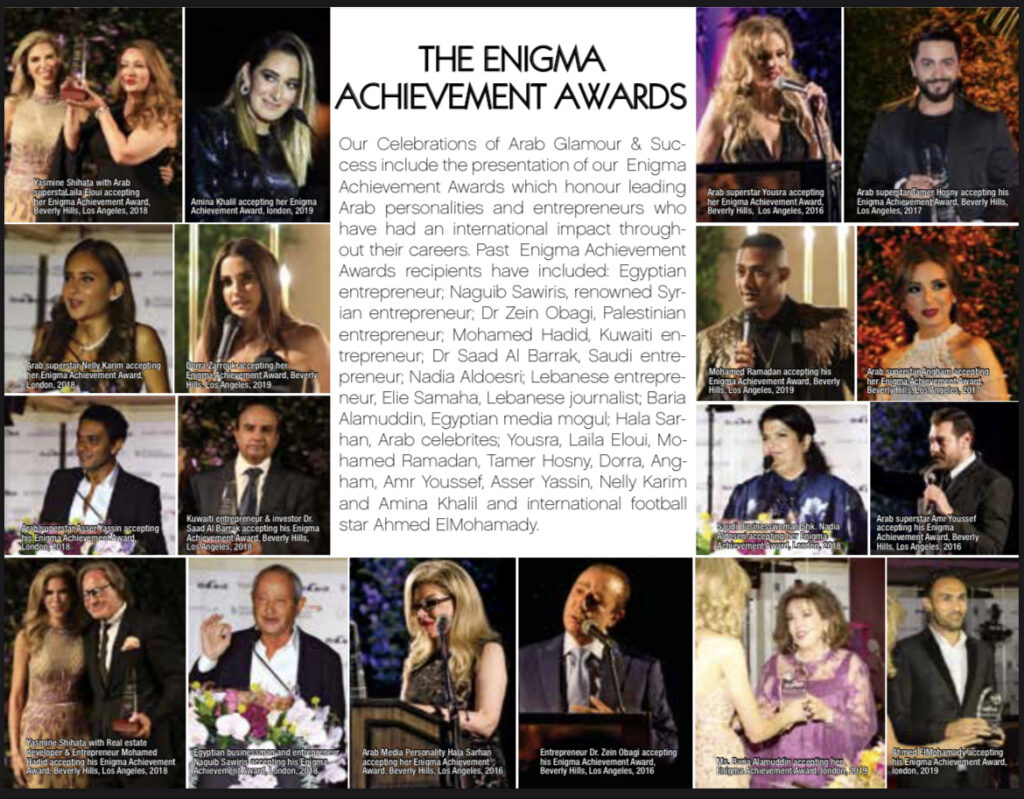 ويهدف الحفل إلى تسليط الضوء على نماذج عربية ناجحة في مختلف المجالات ومد الجسور بين الشرق والغرب. وتحرص مجلة إنجما على تكريم عدد من نجوم الفن ورجال الأعمال العرب في احتفاليتها، وسبق أن كرمت المجلة عدة شخصيات عربية مرموقة مثل الأعمال نجيب ساويرس والمهندس المعماري محمد حديد وسيدة الأعمال نادية الدوسري، ومن نجوم الفن يسرا ودرة وآسر ياسين ونيللي كريم وأنغام وأمينة خليل .