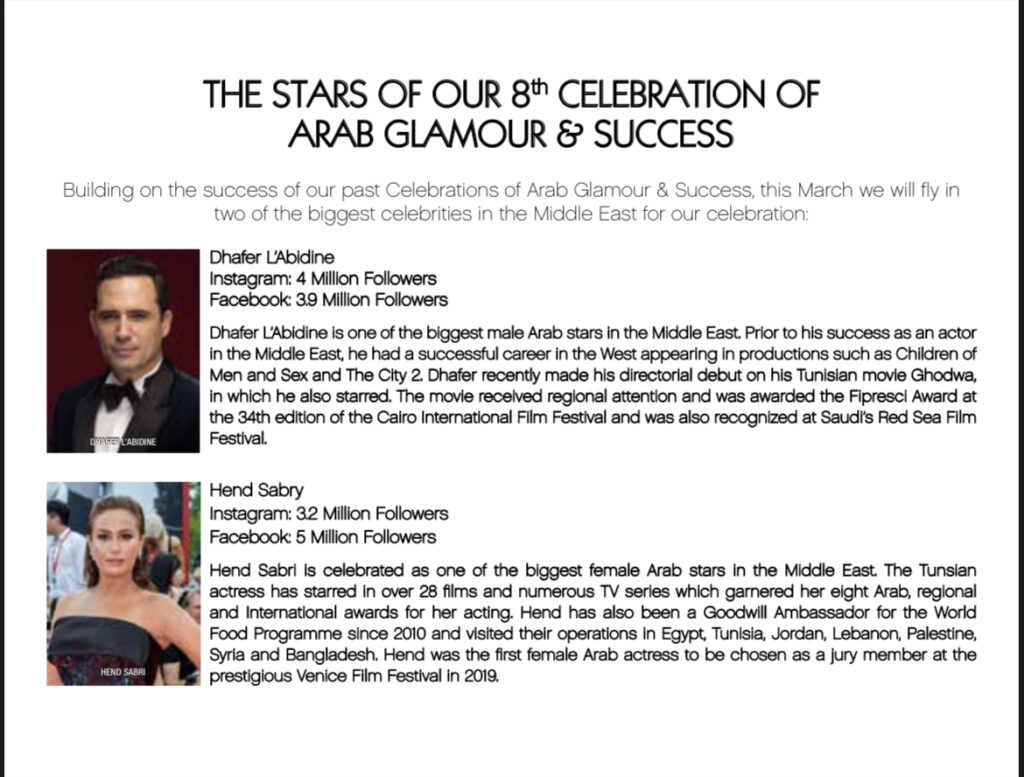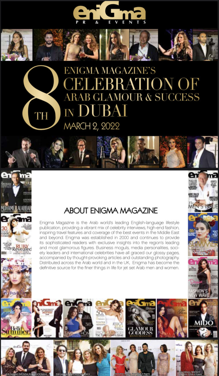 أعلنت مجلة إنجما الرائدة في مجال أسلوب الحياة والموضة في الشرق الاوسط عن عزمها تنظيم احتفالها الثامن بالتألق والنجاح العربي في شهر مارس القادم في إمارة دبي بدولة الإمارات العربية والمقرر تنظيمه في فندق أرماني ببرج خليفة بحضور نخبة كبيرة من نجوم الفن والمجتمع العربي والعالمي.وستكرم مجلة إنجما هذا العام من الشخصيات البارزة رجل الأعمال الإمارتي محمد العبار ورجل الأعمال حسين النويس ورجل الأعمال اللبناني باتريك شلهوب، ومن نجوم الفن الممثلة التونسية هند صبري.