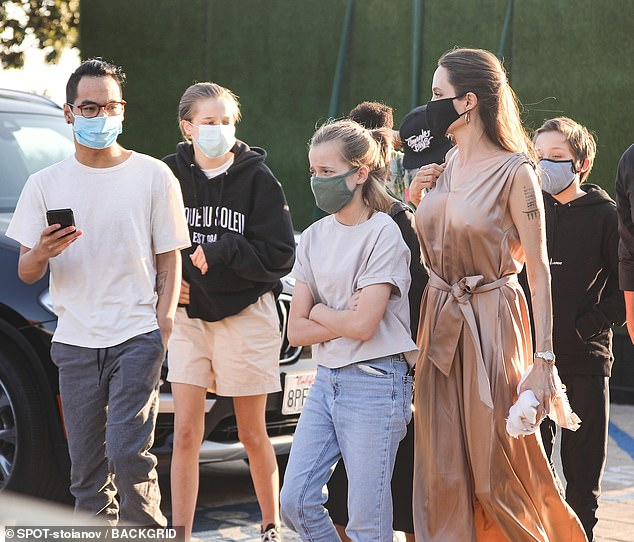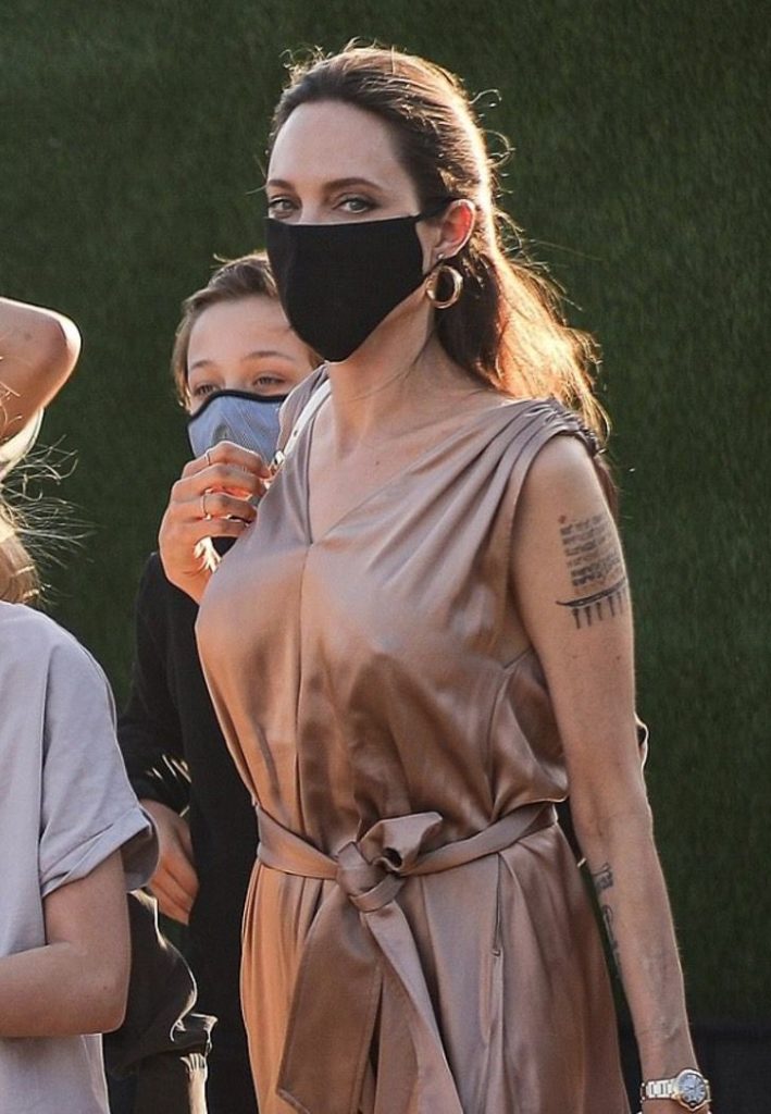 التقطت عدسات المصورين ظهور النجمة العالمية أنجلينا جولي في مدينة ماليبو بكاليفورنيا الأمريكية، بصحبة أطفالها الخمسة في سهرة عشاء عائلية في أحد المطاعم الشهيرة، وسط التزامهم بالإجراءات الاحترازية وارتداء الكمامات الطبية لعدم الإصابة بفيروس كورونا.