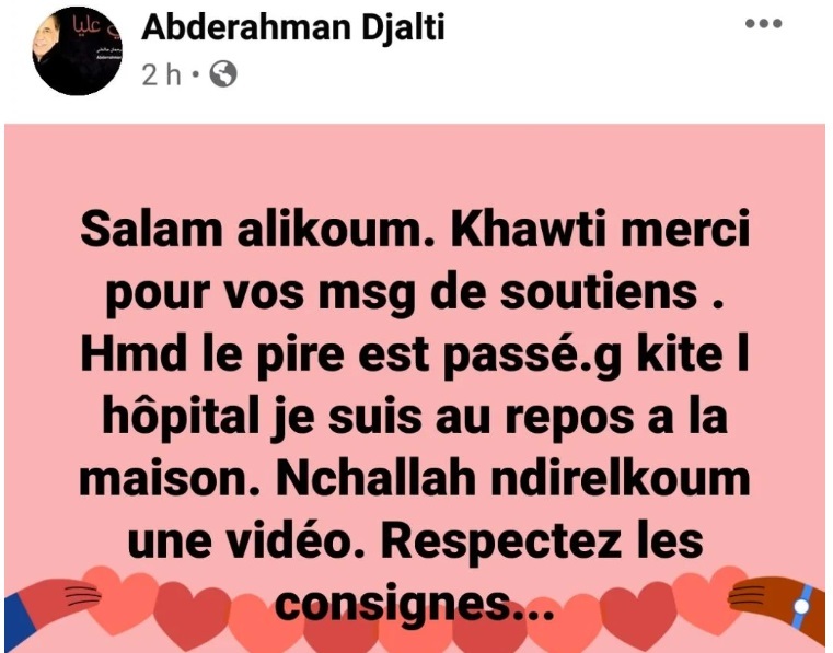 وقام جلطي، بتوجيه رسالة ليطمئن كل متتبعيه ومحبيه عن حالته، مضيفا: “مر الأسوأ، وغادرت المستشفى وأنا في فترة راحة بالمنزل، وسأصور فيديو لأطمئنكم أكثر عن حالتي الصحية”، وفق روسيا اليوم.