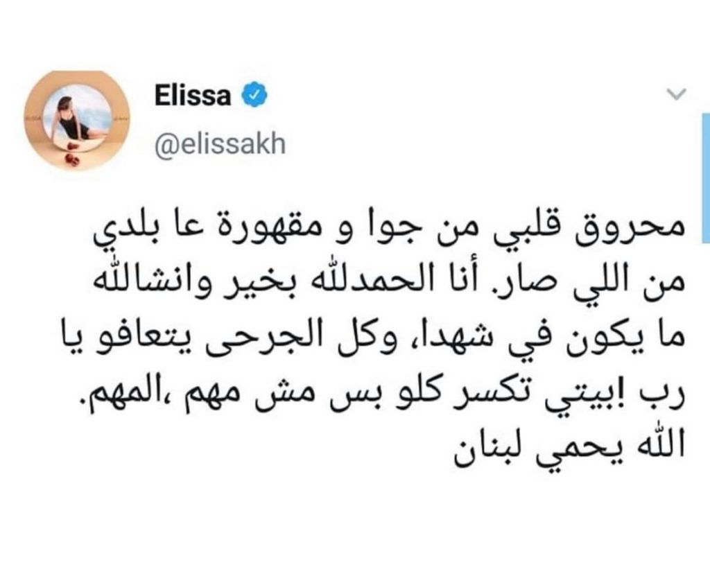 وأعربت عبر صفحتها الشخصية على فيسبوك عن حزنها لما حصل لبلدها لبنان متمنية السلامة للجميع، قائلة: “محروق قلبي من جوا ومقهورة عا بلدي من يلي صار. أنا الحمدلله بخير وانشالله ما يكون في شهداء وكل الجرحى يتعافو يارب! بيتي تكسر كلو بس مش مهم.. المهم الله يحمي لبنان”.