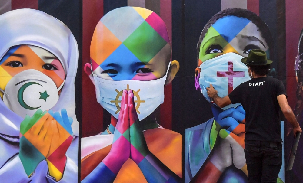 Brazilian mural artist Eduardo Kobra works on his recent work "Coexistence" -which shows children wearing face masks due to the new coronavirus, COVID-19, bearing symbols of different religions (L to R) Islam, Buddhism and Christianity- in Itu, some 100 km from Sao Paulo, Brazil on April 25, 2020. (Photo by NELSON ALMEIDA / AFP)
