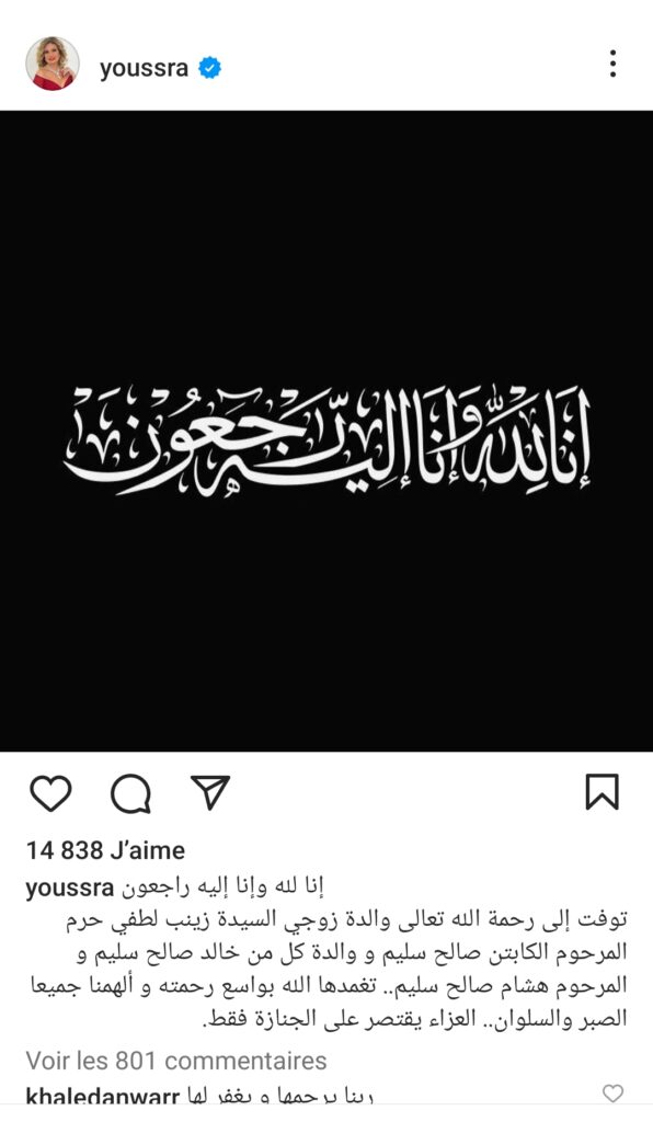 وكتبت يسرا :”إنا لله وإنا إليه راجعون، توفيت إلى رحمة الله تعالى والدة زوجي السيدة زينب لطفي حرم المرحوم الكابتن صالح سليم ووالدة كل من خالد صالح سليم والمرحوم هشام صالح سليم”.