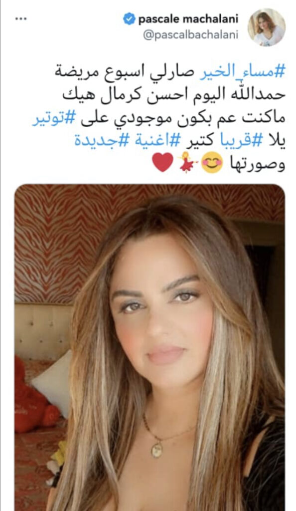 وكتبت الفنانة باسكال في تغريدة لها عبر تويتر، بعد تحسن صحتها، جاء فيها: “مساء الخير صارلي اسبوع مريضة حمدالله اليوم احسن كرمال هيك ماكنت عم بكون موجودي على توتير يلا قريبا كتير اغنية جديدة وصورتها”.