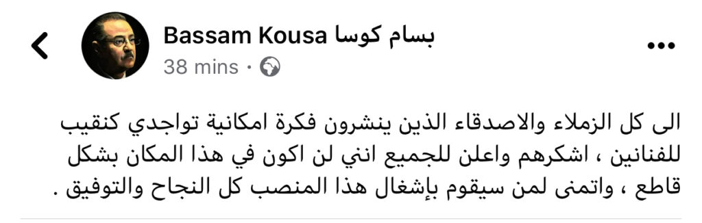 نفى الفنان بسام كوسا إمكانية تسلمه منصب نقيب الفنانين بعد انتشار شائعات حول ذلك، وكتب عبر صفحته في فيسبوك “إلى كل الزملاء والأصدقاء الذين ينشرون فكرة إمكانية تواجدي كنقيب للفنانين، أشكرهم وأعلن للجميع أنني لن أكون في هذا المكان بشكل قاطع ، وأتمنى لمن سيقوم بإشغال هذا المنصب كل النجاح والتوفيق”.