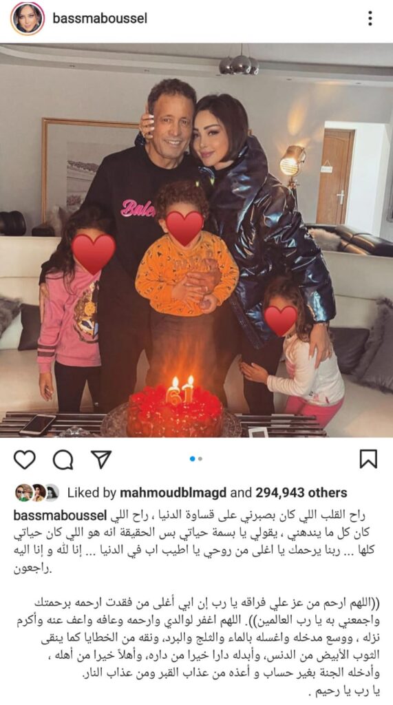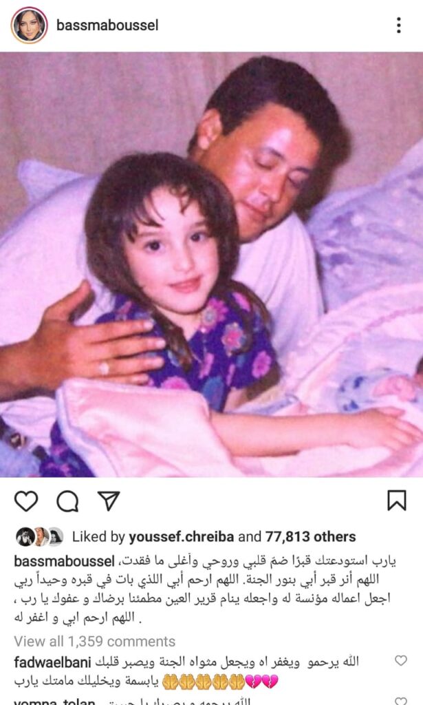 وكانت بسمة بوسيل، أعلنت وفاة والدها عبر حسابها على “إنستجرام” حيث نشرت صورة  تجمعها به هي وابنتها واخرى وهي طفلة بجواره قائلة : “راح القلب اللي كان بصبرني على قساوة الدنيا، راح اللي كان كل ما يندهني، يقولي يا بسمة حياتي بس الحقيقة إنه هو اللي كان حياتي كلها.. ربنا يرحمك يا أغلى من روحي يا أطيب أب في الدنيا.. إنا لله وإنا إليه راجعون”.