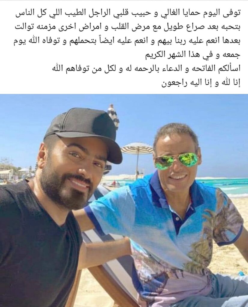 ونشر تامر، صورة تجمعه به وعلّق عليها قائلا: “توفي اليوم حمايا الغالي وحبيب قلبي.. الراجل الطيب اللي كل الناس بتحبه بعد صراع طويل مع مرض القلب وأمراض أخرى مزمنة توالت بعدها”.