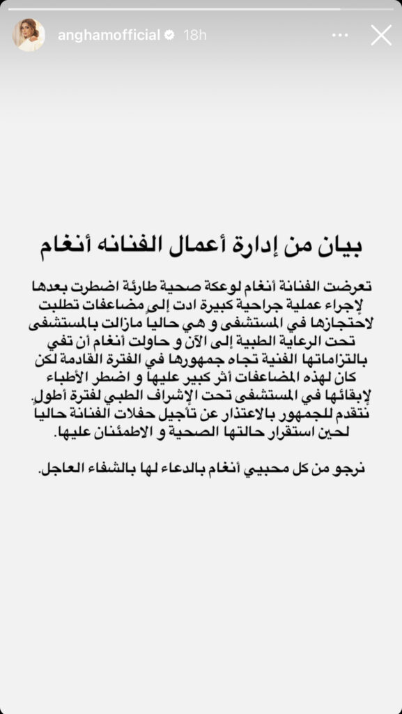وجاء في البيان: “تعرضت الفنانة أنغام لوعكة صحية طارئة اضطرت بعدها لإجراء عملية جراحية كبيرة أدت إلى مضاعفات تطلبت احتجازها في المستشفى وهي حالياً مازالت بالمستشفى تحت الرعاية الطبية إلى الآن”.
