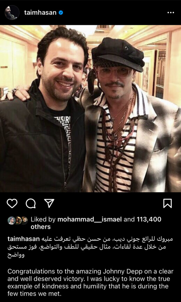ونشر “حسن” عبر صفحته الرسمية على “فيسبوك” صورة جمعته بـ “ديب” وعلق: “مبروك للرائع جوني ديب، من حسن حظي تعرفت عليه من خلال عدة لقاءات، مثال حقيقي للطف والتواضع، فوز مستحق وواضح”.