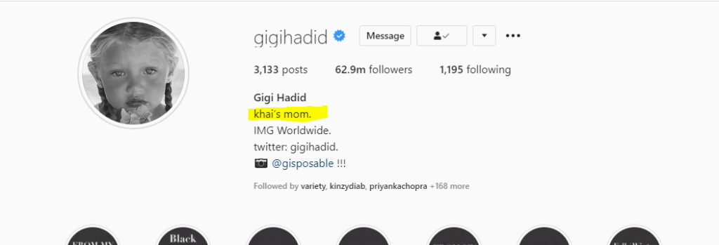 كشفت عارضة الأزياء العالمية جيجي حديد أخيرا عن اسم ابنتها من زين مالك بعد 4 أشهر من ولادتها، حيث أطلقت عليها اسم ” khai”، وقامت جيجي بإعلان الاسم عبر حسابها بموقع أنستجرام، ولكنها لم تصدر إعلانا بالشكل الصريح، حيث اكتفت بتغيير تعريف السيرة الذاتية لها في الملف الشخصي بإضافة جملة ” khai’s mom”.
