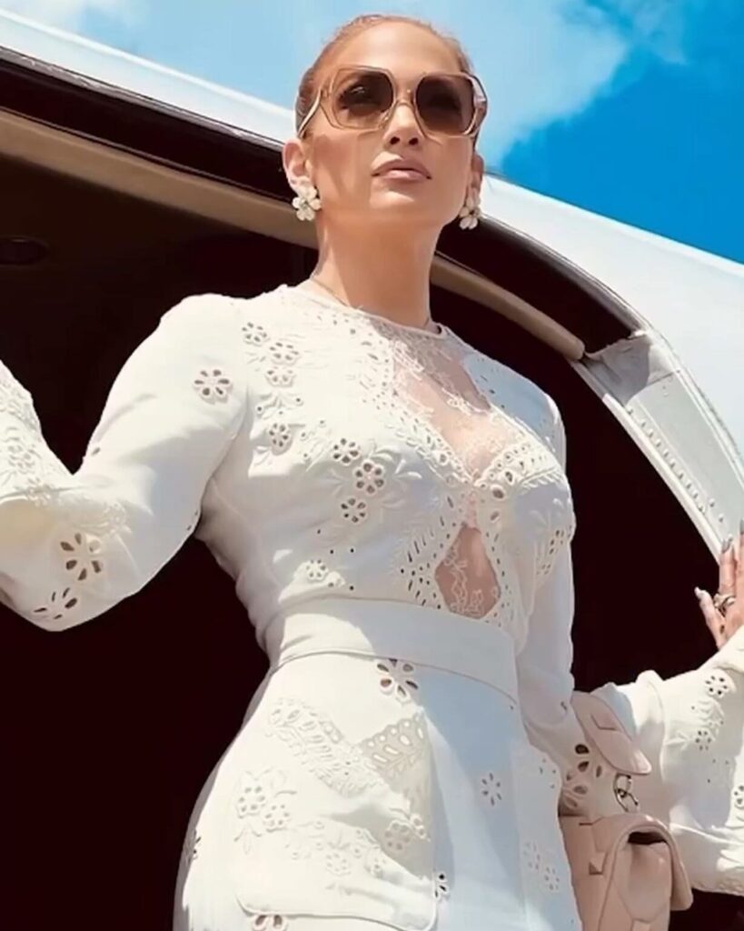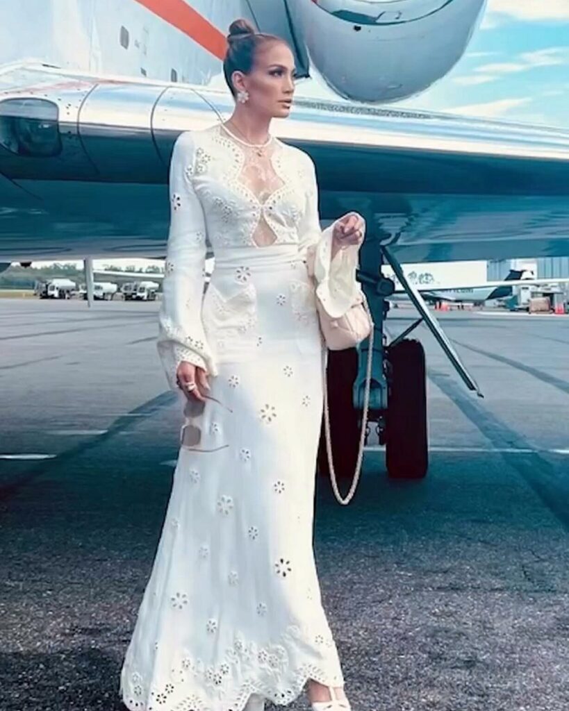 اختارت لوبيز فستاناً أبيضاً مطرزاً بالأزهار من مجموعة الأزياء لربيع وصيف ٢٠٢٣ خلال جولة لها لإحدى علاماتها التجارية للمشروبات.