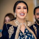 كما وضعت على عينيها نظارات شمسية ذهبية من خط نظارات ايلي صعب أيضاً.