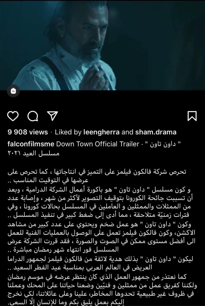 وتابع البيان ” كون مسلسل ” داون تاون ” هو باكورة أعمال الشركة الدرامية، وبعد أن تسببت جائحة كورونا بتوقيف التصوير لأكثر من شهر، وإصابة عدد من الممثلات والممثلين والعاملين في المسلسل بحالات كورونا، وفي فترات زمنيّة متلاحقة، مما أدى إلى ضغط كبير في تنفيذ المسلسل”.