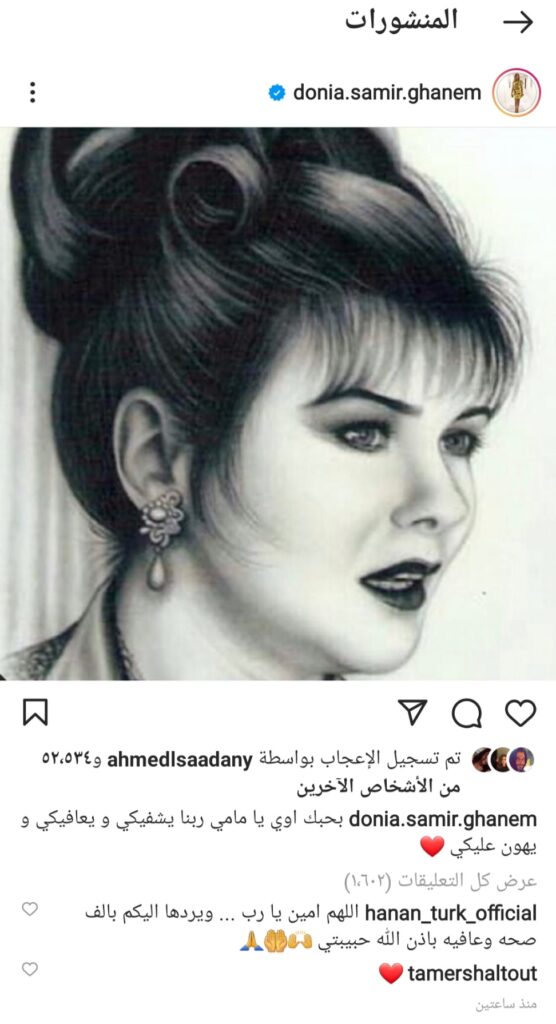 ونشرت دنيا سمير غانم صورة للفنانة دلال عبد العزيز، عبر حسابها الشخصي بموقع التواصل الاجتماعي انستغرام، وكتبت “بحبك أوي يا مامي ربنا يشفيكي و يعافيكي ويهون عليكي”.