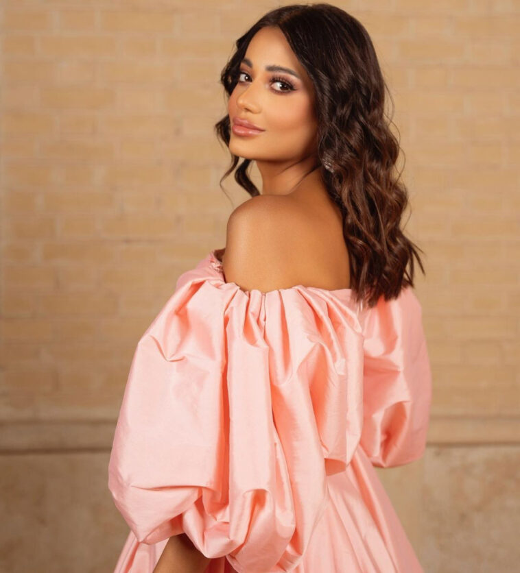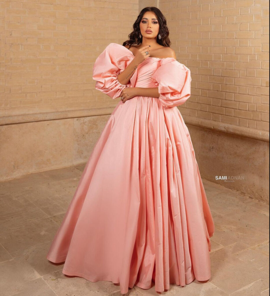 ولفتت رحمة الأنظار إليها بإطلالتها، فارتدت فستاناً طويلاً باللون الزهري، منتفخ الأكمام، وتركت شعرها منسدلاً على كتفيها.