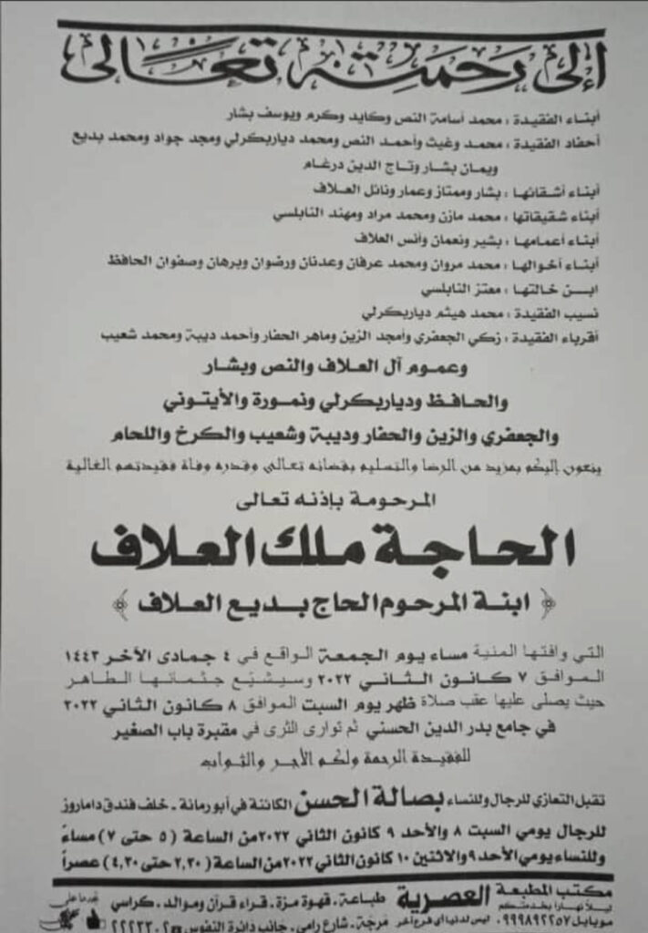تقبل التعازي في صالة الحسن بمنطقة أبو رمانة، للرجال يومي السبت والأحد (من ٥ حتى ٧ مساءً)، وللنساء يومي الأحد والاثنين (من ٢:٣٠ حتى ٤:٣٠).