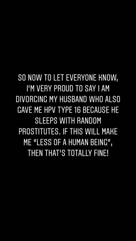 وفجرت روان، مفاجأة، قائلة: “اليوم أقولها بكل فخر وشجاعة، أعلن طلاقى من زوجى، الذى نقل لى عدوى فيروس الورم الحليمى HPV 16 بسبب علاقاته المتعددة والعشوائية، إذا كان تصرفى هذا سيقلل من شأنى، فليكن لم أعد أكترث وأهتم، أنا سعيدة ومتحمسة لبداية فصل جديد من حياتى”.