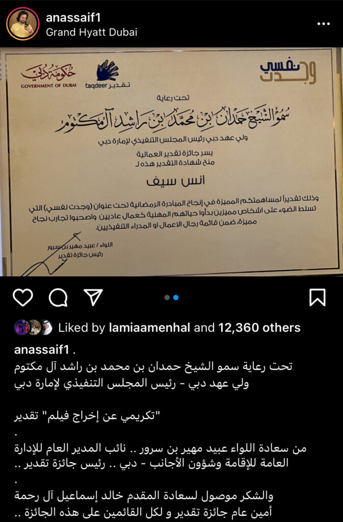 تحت رعاية سمو الشيخ حمدان بن محمد بن راشد آل مكتوم – ولي عهد دبي – رئيس المجلس التنفيذي لإمارة دبي، كُرم المخرج المصري أنس سيف ومُنح جائزة “تقدير العمالية” عن فيلمه الوثائقي “تقدير”.