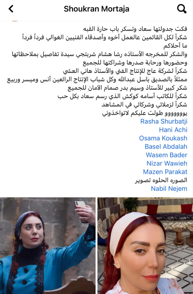 ووجهت مرتجى الشكر في نهاية التصوير لكل طاقم العمل، حيث كتبت عبر صفحتها على الفيسبوك: ” فكت جدولتها سعاد وتسكر باب حارة القبه.. شكراً لكل القائمين عالعمل أخوه وأصدقاء الفنيين الغوالي فرداً فرداً.. ما أحلاكم .. والشكر للمخرجه الأستاذه رشا هشام شربتجي سيدة تفاصيل بملاحظاتها وحضورها ورحابة صدرها وشراكتها للجميع.. شكراً لشركة عاج للإنتاج الفني والأستاذ هاني العشي ممثلاً بالصديق باسل عبدالله وكل شباب الإنتاج الرائعين حقيقة .. شكر كبير للأستاذ وسيم بدر صمام الآمان للجميع.. شكراً للكاتب أسامه كوكش الذي رسم سعاد بكل حب .. شكراً لزملائي وشركائي في المشاهد”.