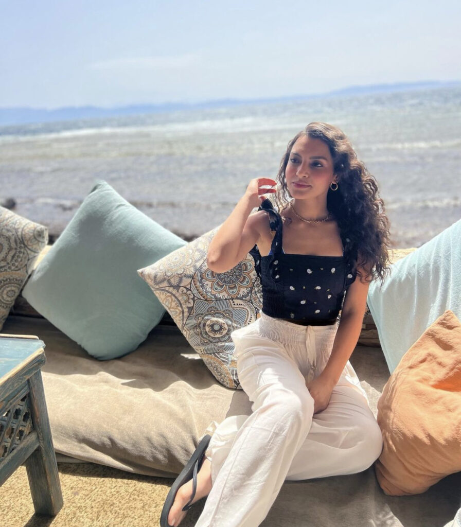 وظهرت كارمن سليمان في الفيديو والصور بإطلالة صيفية، وارتدت بنطلون أبيض واسع وتيشرت أسود كات، واعتمدت على ماكياج ناعم أبرز جمال ملامحها وتركت شعرها الكيرلي منسدلاً على أكتافها.