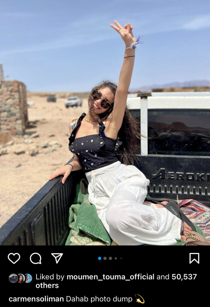 شاركت الفنانة كارمن سليمان متابعيها بمجموعه صور جديدة لها ومقطع فيديو من رحلتها بـ “دهب” عبر صفحتها الشخصية على موقع انستغرام.