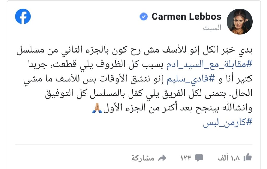 وقالت كارمن في تعليق نشرته عبر صفحتها الرسمية على موقع التواصل الاجتماعي «فيسبوك»: «بدي خبّر الكل إنو للأسف مش رح كون بالجزء التاني من مسلسل مقابلة مع السيد آدم بسبب كل الظروف يلي قطعت، جربنا كتير أنا وفادي سليم إنو ننسّق الأوقات بس للأسف ما مشي الحال. بتمنى لكل الفريق يلي كمّل بالمسلسل كل التوفيق وانشالله بينجح بعد أكتر من الجزء الأول».