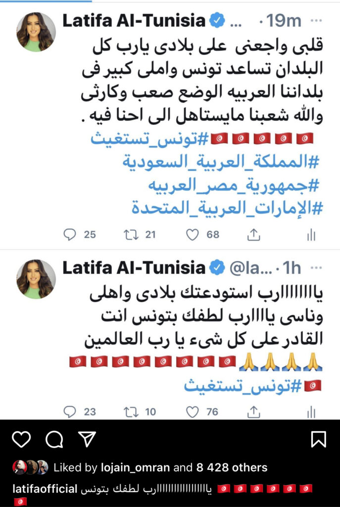 وغرّدت لطيفة بالقول: “يارب استودعتك بلادي وأهلي وناسي، يارب لطفك بتونس أنت القادر على كل شىء يا رب العالمين” وتابعت: “قلبي واجعني على بلادي يارب كل البلدان تساعد تونس وأملى كبير فى بلداننا العربية، الوضع صعب وكارثي، والله شعبنا مايستاهل إلى إحنا فيه”.