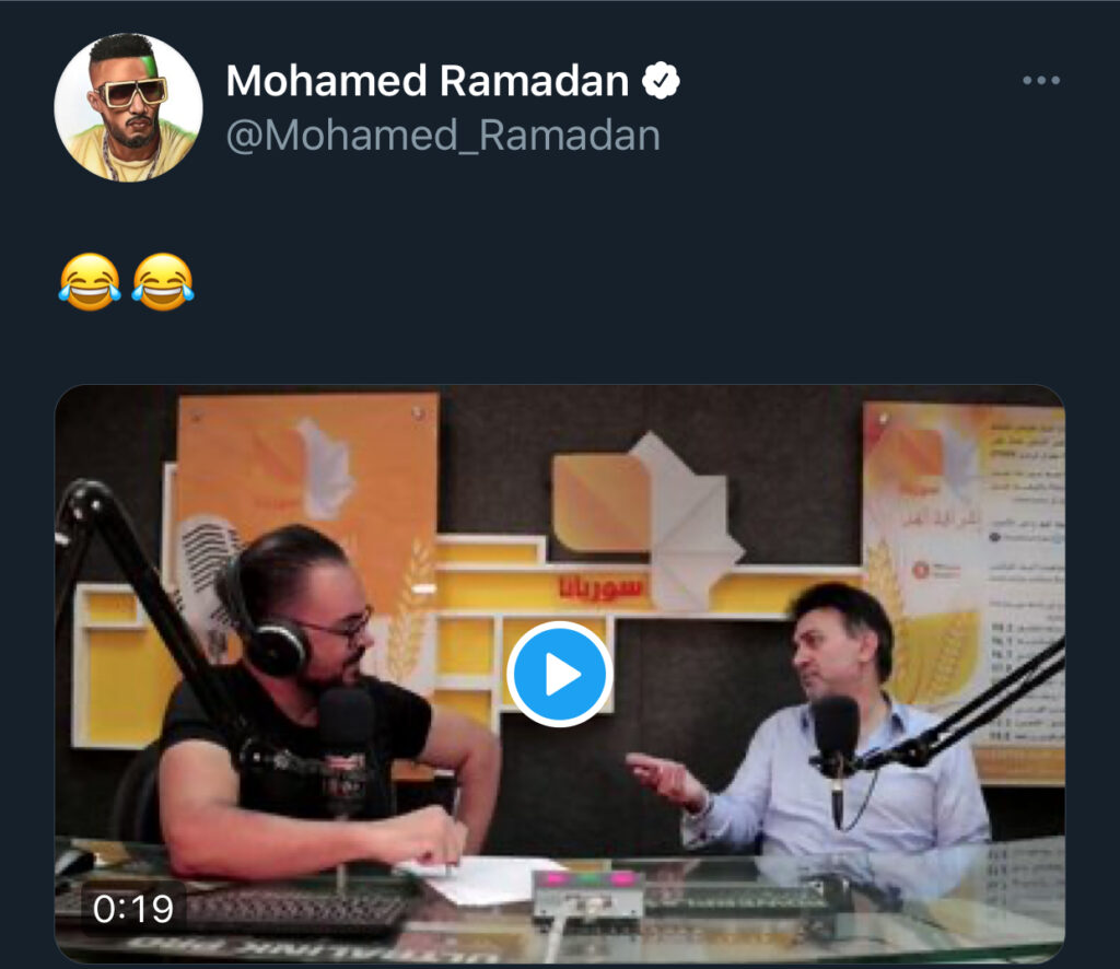 بالمقابل، نشر محمد رمضان في حسابه الخاص على موقع التواصل الإجتماعي، مقطع فيديو الذي يظهر حديث فراس إبراهيم عنه قائلاً: “محمد رمضان مستفز لدرجة أن تضع لايك”، وعلق رمضان على الفيديو من خلال الرموز ضاحكاً.