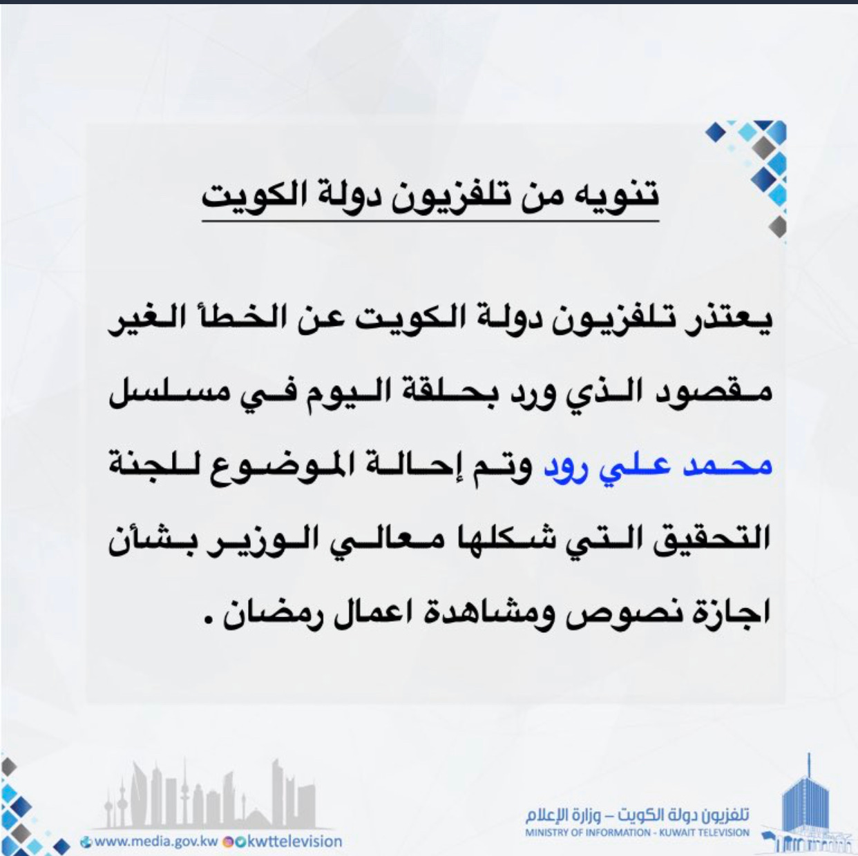 واعتذر «تلفزيون الكويت» عن هذا الخطأ غير المقصود، مؤكدا إحالة الموضوع إلى لجنة التحقيق التي شكلها الوزير بشأن إجازة نصوص ومشاهدة أعمال رمضان”.