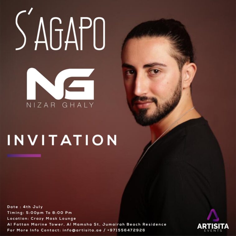 تنظم شركة “ارتيسيتا ايفنتس” بإدارة الفنانة التشكيلية وسيدة الأعمال لمياء منهل، حفل إطلاق أغنية جديدة للفنان نزار غالي بعنوان “SAGAPO”، التي تعني أحبك باللهجة اليونانية.