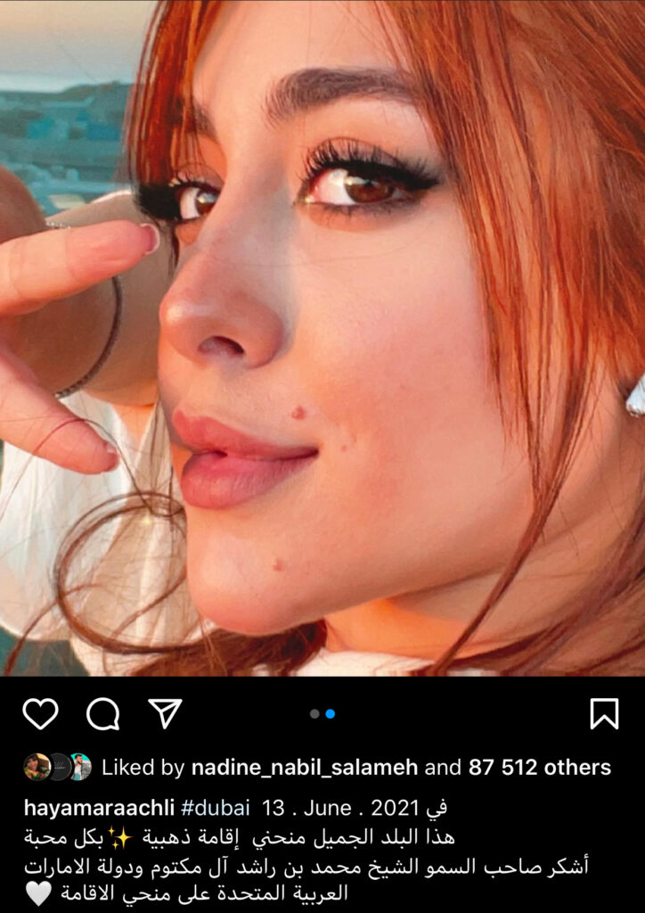 وتابعت: ” بكل محبة اشكر صاحب السمو الشيخ محمد بن راشد آال مكتوم ودولة الامارات العربية المتحدة على منحي الاقامة ”.